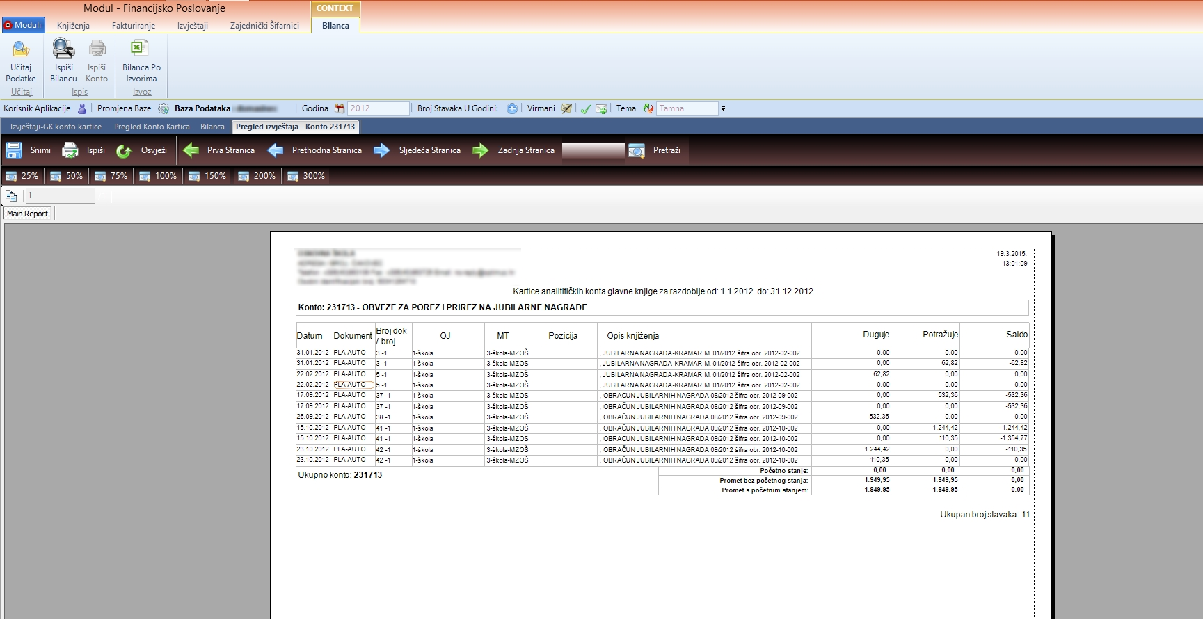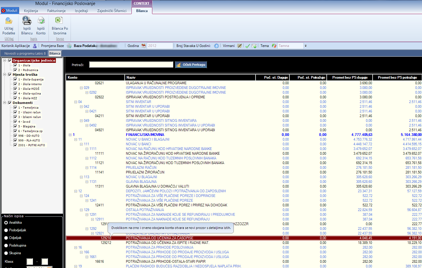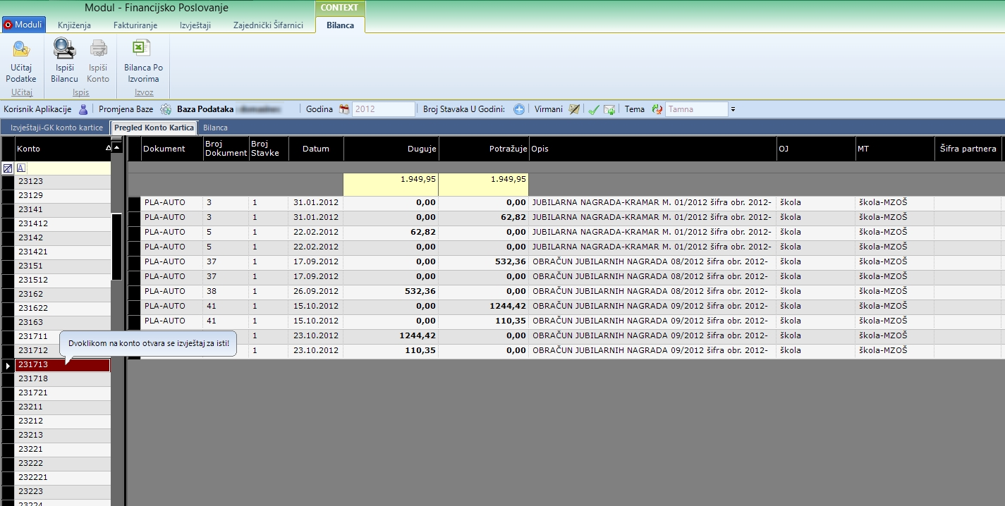 Kod bilance (Financijsko Poslovanje - Izvještaji - Bilanca) dodali smo mogućnost pregleda bilance te direktnog pregleda određenog konta dvoklikom na isti, što se lijepo vidi na slici ispod. Također, klikom na Ispiši Konto možemo ispisati odabrani konto.