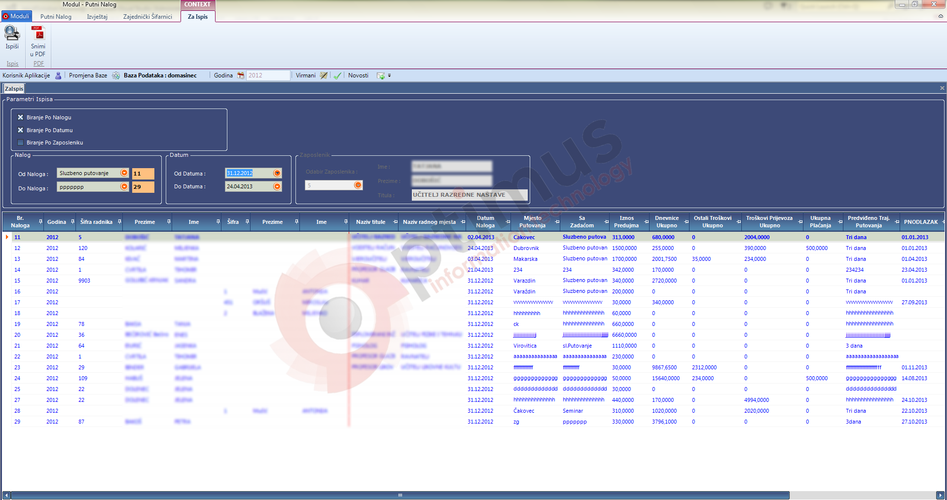 U modulu Putni Nalozi omogućili smo lakše pronalaženje određenog naloga (Putni Nalozi -> Izvještaji -> Pregled Naloga Za Ispis) filtriranjem po broju naloga, datumu kad je isti stvoren, po zaposleniku ili pak po svim navedenim parametrima.