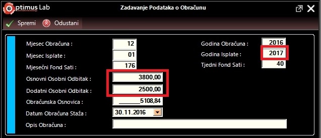 Kod obračuna plaće za 12 mjesec 2016. molimo Vas da obratite pažnju na godinu isplate te na polje Osnovni osobni odbitak i Dodatni osobni odbitak.