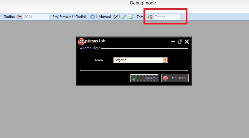u novoj verziji Labis 8 računovodstvenog sustava dodali smo novu mogućnost; teme. Od sad, ukoliko Vam se ne sviđa predefinirana crna boja, možete vratiti na plavu kakva je nekad bila u Labis-u. Na slici ispod možete vidjeti gdje smo postavili gumb za promjenu teme. Nakon što promjenite temu, zatvorite sve prozore unutar Labis-a, a zatim ponovno otvorite da bi promjena bila vidljiva.